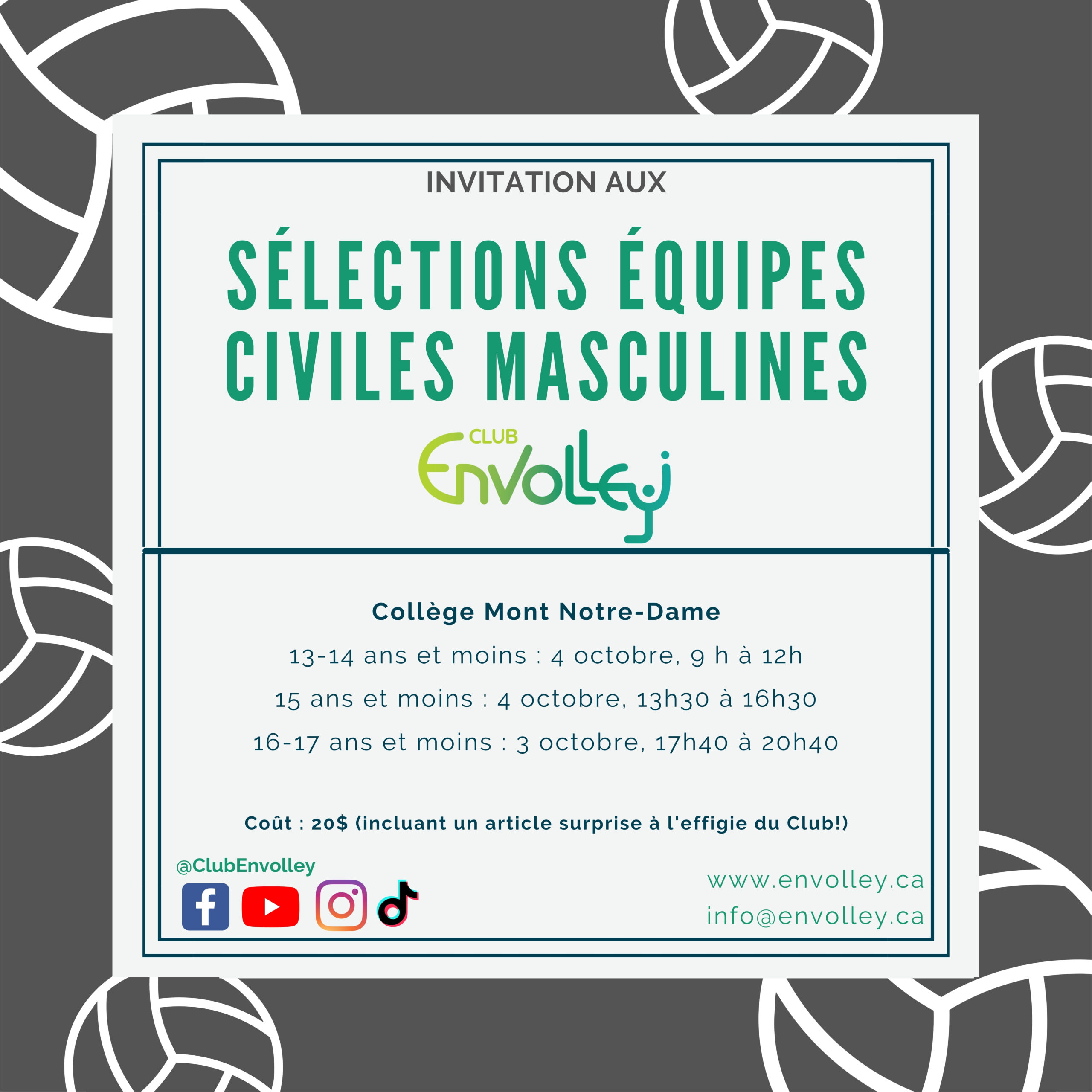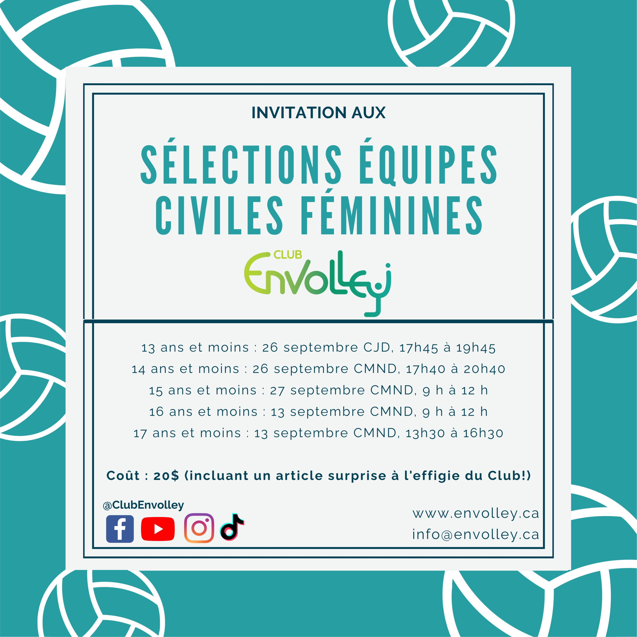 Pour être dans une équipe civile, les athlètes doivent être âgés entre 12 et 18 ans. Ils doivent participer à des sélections en début de saison (septembre ou octobre) afin d’être sélectionnés dans la structure d’excellence du Club Envolley!